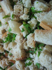 Bake bread 8 to 10 minutes on a sheet pan--It may take longer depending on the size of the cubes of bread (it should be dry!). In large bowl toss bread with remaining ingredients till evenly coated.