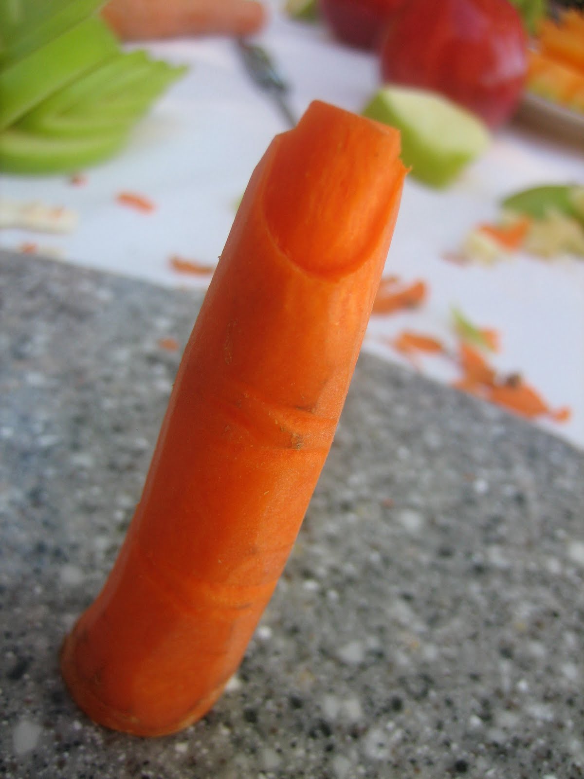 That's my honey! We carved about two-dozen carrots for a "finger food" veggie tray. Even the kids helped - it was a lot of fun and made a lot of people smile. We took the tray to a church party where the carrots were a big hit. I must say, though, that it was a little disconcerting to see a teenage boy walking around the room with "my" thumb in his mouth.