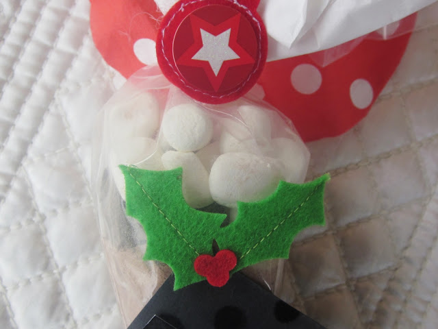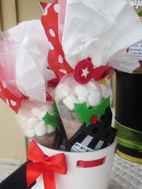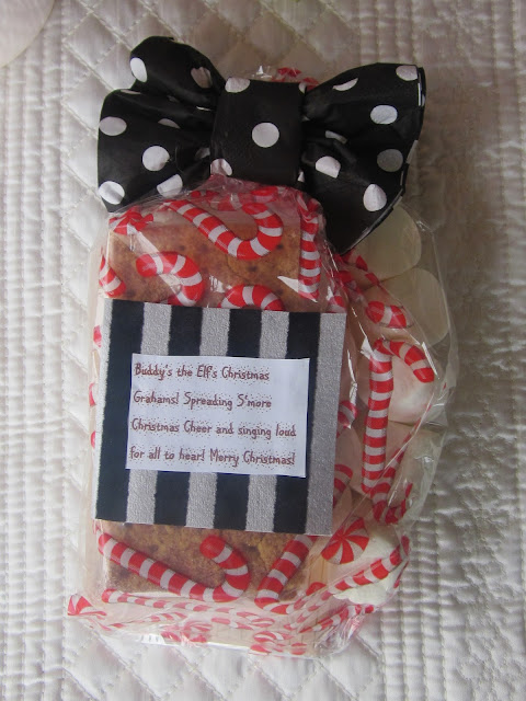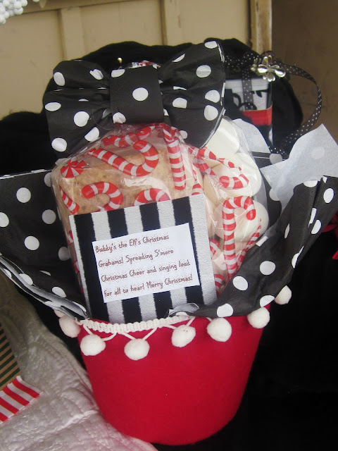 I used a simple goodie bag, some polka-dot napkins and a felt dollar-store bucket. Total cost per gift, right around 2$. Plus...I just love Elf. Dang cute movie.