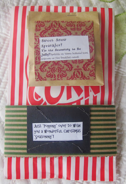 "Tis the Seasoning to be Jolly!" or "Just Popping over to wish you a wonderful Christmas Seasoning" (tag on the popcorn and seasoning).