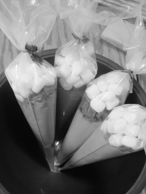 Mint Cocoa Cones or jars: 1/2 cup cocoa mix at the bottom of a plastic pastry bag. 1T crushed peppermint candy or 2T chocolate chunks. Dry small marshmallows on a sheet pan for 24 to 48 hours open air. Place ¼ cup marshmallows at the top of the bag, leaving enough room to tie the bag. Tie with a twist tie and a bow. If you use jars, use the half-pint jars and the same directions: