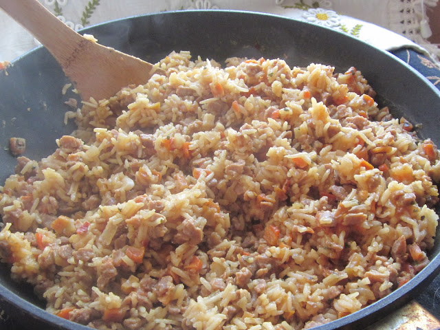 In 2 quart pot with lid, combine the rice bag contents with 3 cups hot water. Cover tightly and simmer very low heat 20 minutes. While the rice is cooking, combine the topping contents with 3 cups water and simmer low heat 15-20 minutes until vegetables and meat are hydrated and sauce thickens slightly.