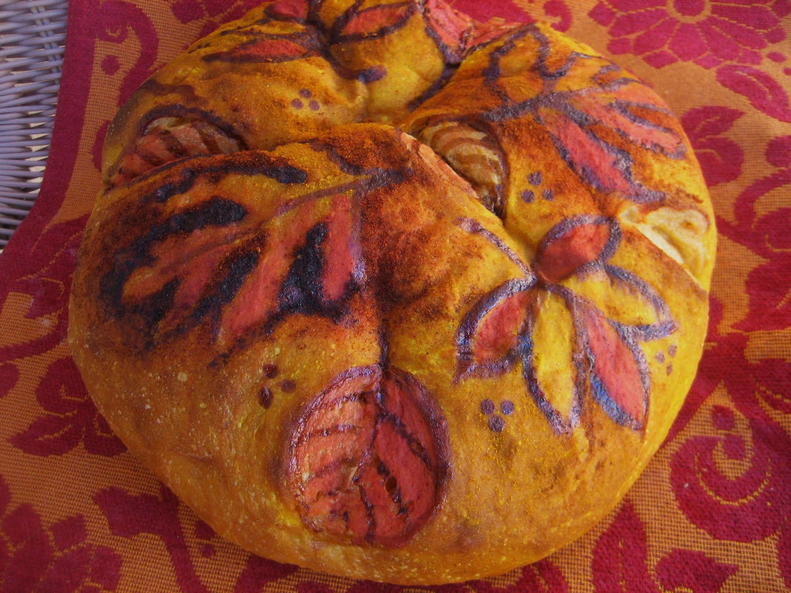 Place leaves and flowers on the loaf as desired for decoration. Spray heavily with water and allow loaf to raise about 30 minutes on a parchment lined bake sheet. Bake at 350 degrees 45-50 minutes.