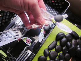 Hot glue and a few rocks with some funky ribbon snazz up the forks for the party too! Not of course for a really small kiddo party since the rocks could present a choking hazard. FYI. That's my legal disclaimer.